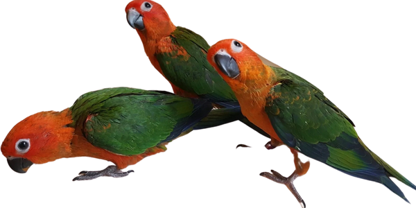 A very bonded pair of birds that found their way to Birds Anonymous as Sun Conures - but perhaps are a Jenday Conure male (Mango) and a Sun Conure hen (Precious). Fairly quiet compared to other Suns, they are a pleasant and brightly colored pair of birds in the aviary! Precious laid her first clutch of eggs in early 2022. Each baby has had a different pattern of orange and yellow feathers through the shoulder of an otherwise green wing. Appearing as first generation hybrid Jenday and Sun Conures, we affectionately call their colorful offspring "Sunday Conures".
